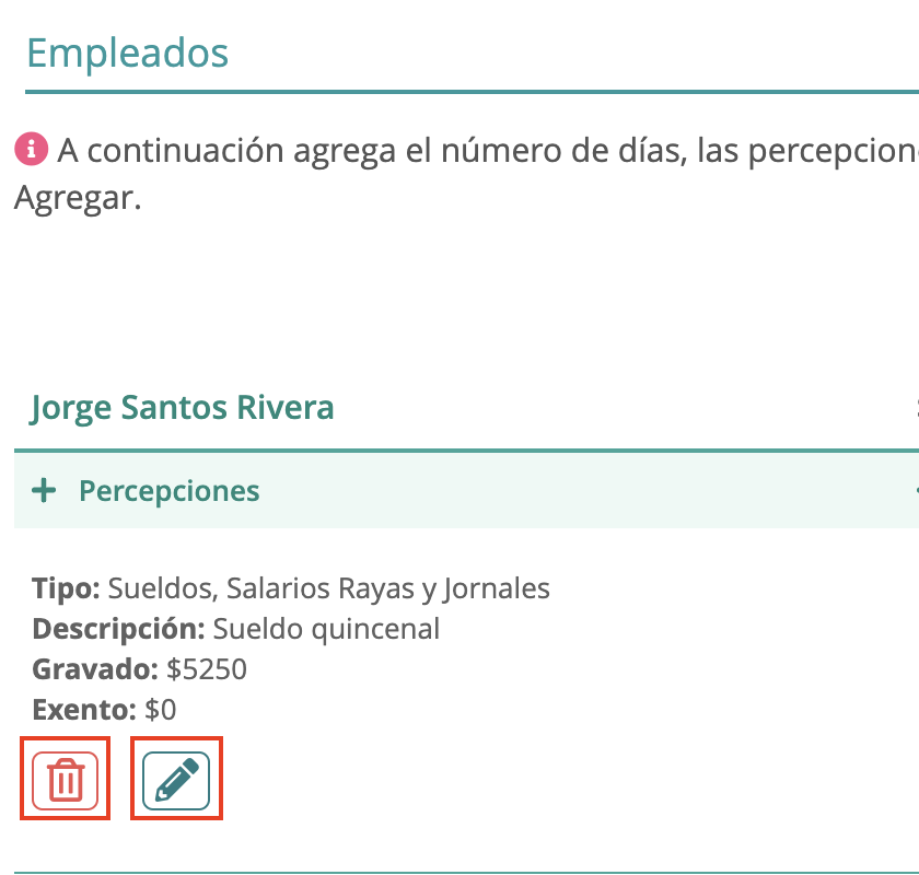 Al presionar en el botón “Agregar“, se verá reflejada la información ingresada en el empleado correspondiente. Es posible Editar o Eliminar la información que ya se agregó.