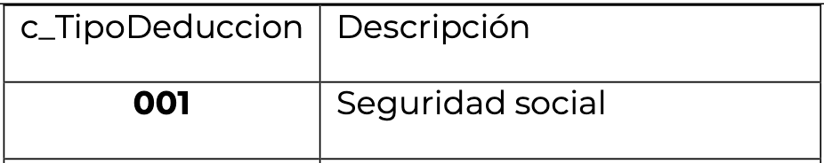 Atención. Es importante considerar que, aunque la descripción no coincida textualmente con el tipo de deducción, se debe cuidar que el concepto utilizado si tenga relación y sea concordante con la descripción de dicho catálogo del tipo de deducción que corresponda.